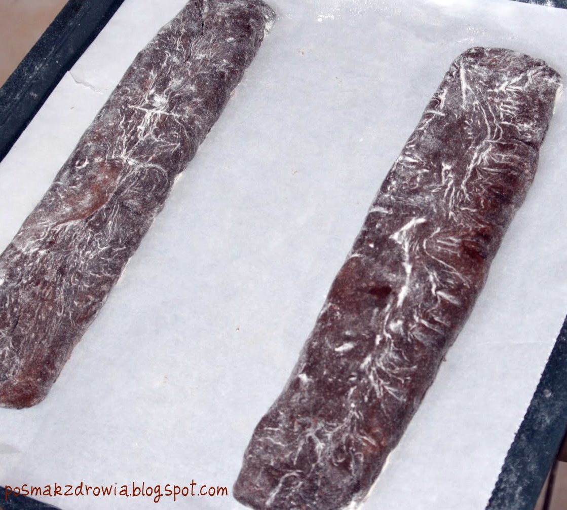 a następnie formujemy dwa „bochenki” ciasta o wymiarach 30 cm x 3 cm. ( w trakcie formowania, należy ciasto, ręce i szpatułkę która będzie pomocna w formowaniu „bochenków”, oprószyć mąką).